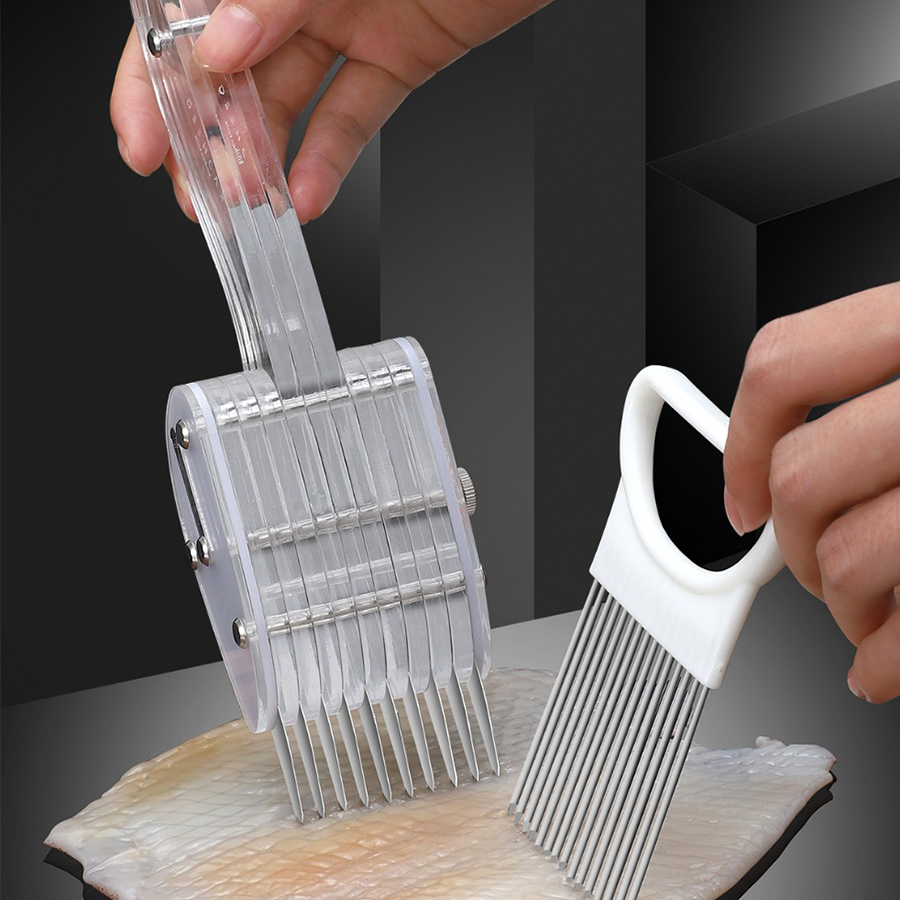 Bộ dụng cụ cắt khía thịt đa năng KACHEEG DYZII cao cấp giúp bạn từ một người không chuyên trở thành đầu bếp chuyên nghiệp, chỉ cần 1 lần đưa dao là bạn đã có thể khía được 10 đường khía thịt với vân thịt đều, đẹp, sắc nét